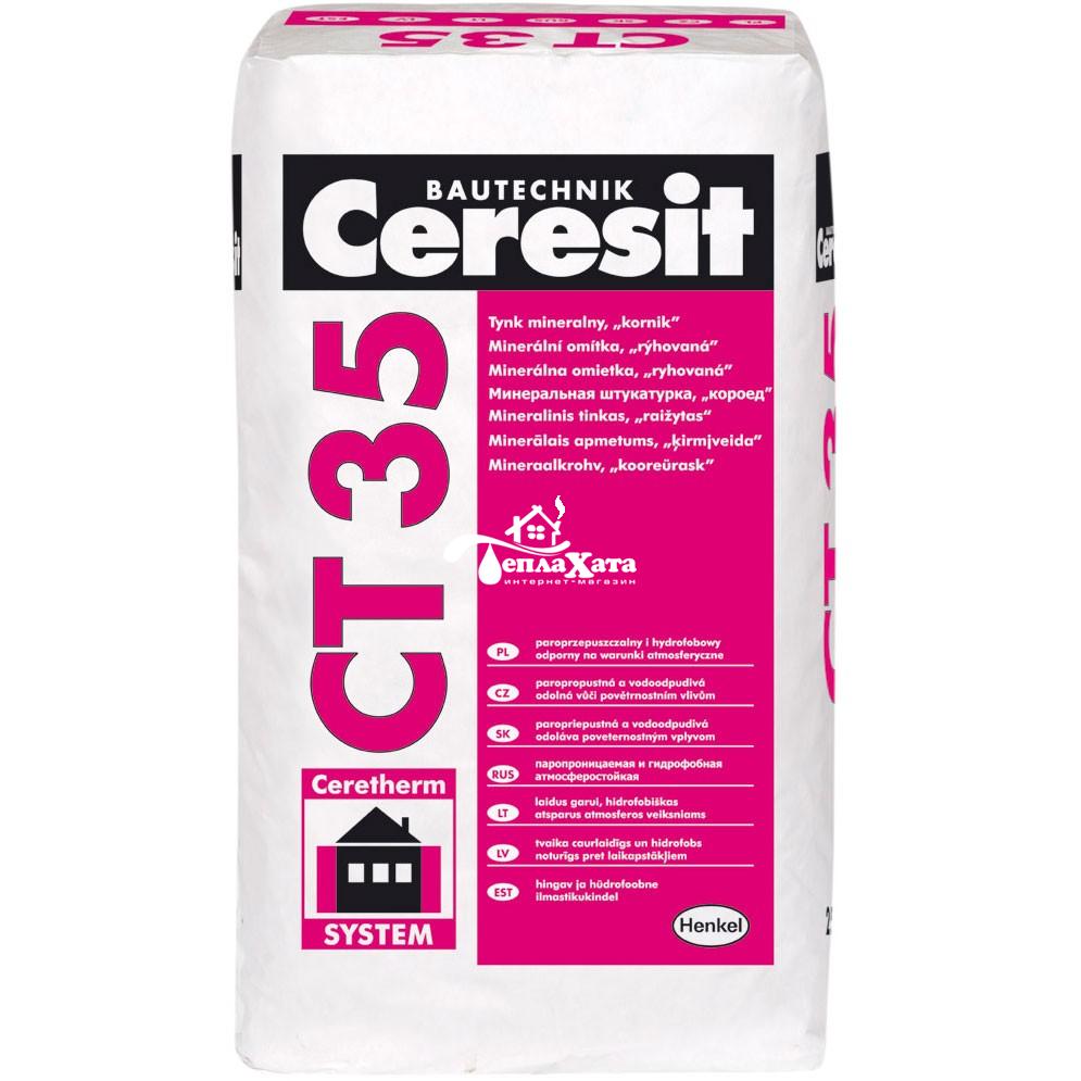 Ceresit СТ 35 выпускается белая, 7-ми пастельных цветов, в соответствии с картой цветовых тонов, и под покраску. Поверхность штукатурки имеет фактуру, исчерченную бороздами («изъеденной короедом»). Экономичный вариант белой штукатурки Ceresit СТ 35 «под покраску» отличается меньшей степенью белизны. Для отделки цоколя рекомендуется использовать «мозаичную» штукатурку Ceresit СТ 177.
