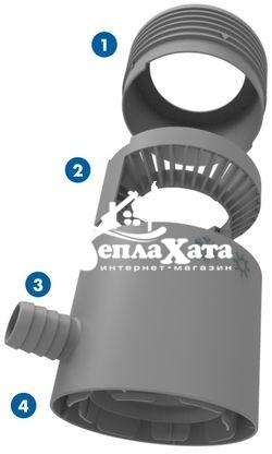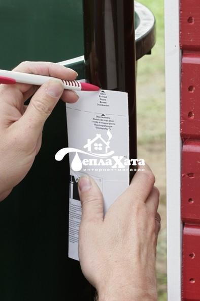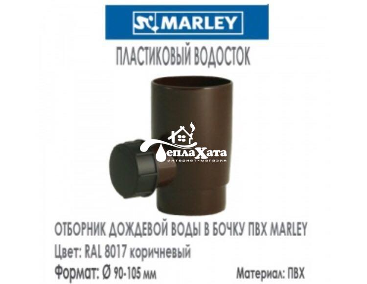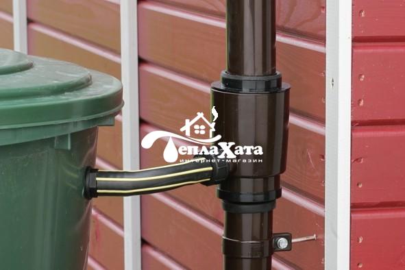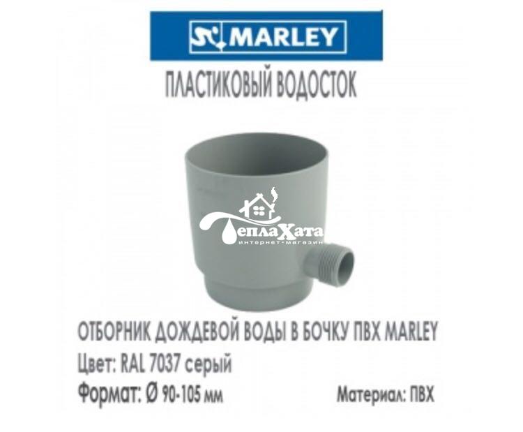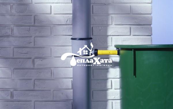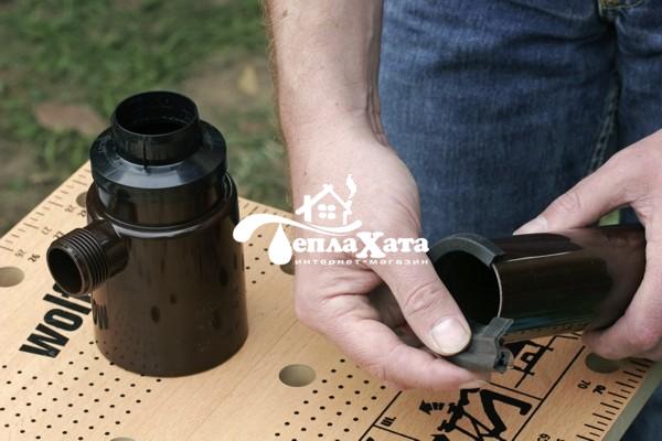 Муфты, позволяющей подсоединиться к любым водосточным трубам Ф=80-105 мм. Муфта позволяет переключить сбор воды в бочку на зимний режим, когда вся вода будет направляться по трубе, в бочку отбора производиться не будет.Фильтрующего элемента, собирающего крупные включения. Этот фильтр можно легко помытьВстроенный патрубок, позволяющий подключить шланг 1” (2,54 см)Подсоединение к водосточной трубе (место фиксации скрыто)Монтаж водосборника на трубе.Отборник дождевой воды Marley просто надевается на водосточную трубу. Выставляется высота отборника дождевой воды по верхнему краю бочки. Необходимо соблюсти принцип сообщающихся сосудов: выход из отборник должен быть на одном уровне в уровнем заполнения бочки. Принцип сообщающихся сосудов состоит в том, что вода течет назад в трубу, когда бочка полностью заполнена.