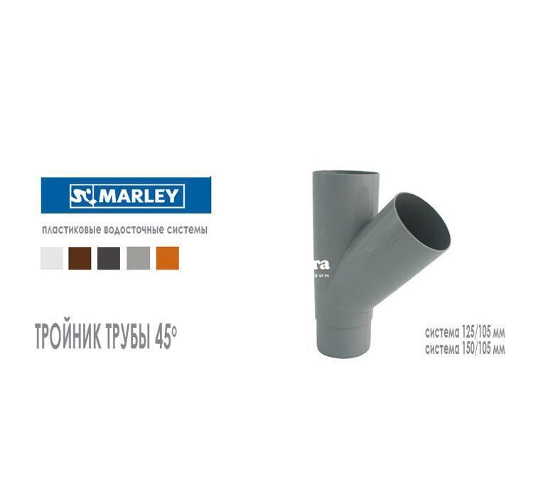 Тройник трубы 45 градусов применяется для сведения двух водосточных труб в одну и часто применяется в случаях, когда необходимо отвести воду с желоба верхнего уровня или уровня эркера. В иных случаях такая необходимость вызвана архитектурными особенностями дома.