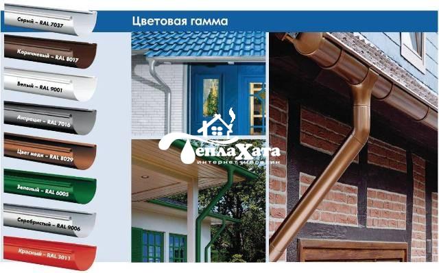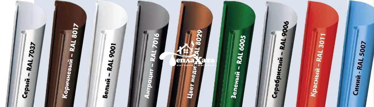 Желоба также выпускаются различных цветовых исполнениях. Наиболее популярные цвета (коричневый и белый) находятся на складе в Харькове, остальные цвета можно привезти по специальному заказу из Германии (следует запрашивать цену и сроки поставки, поскольку цена на заказные позиции является расчетной и может отличаться от цены на складские позиции).