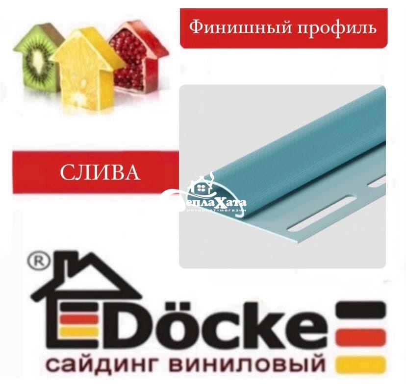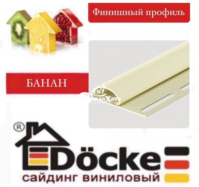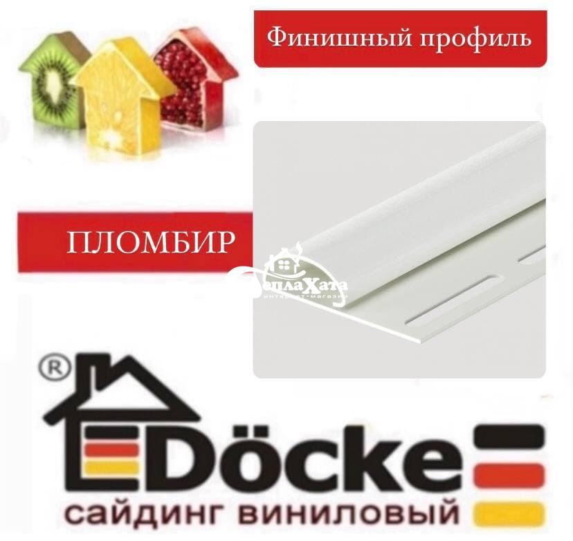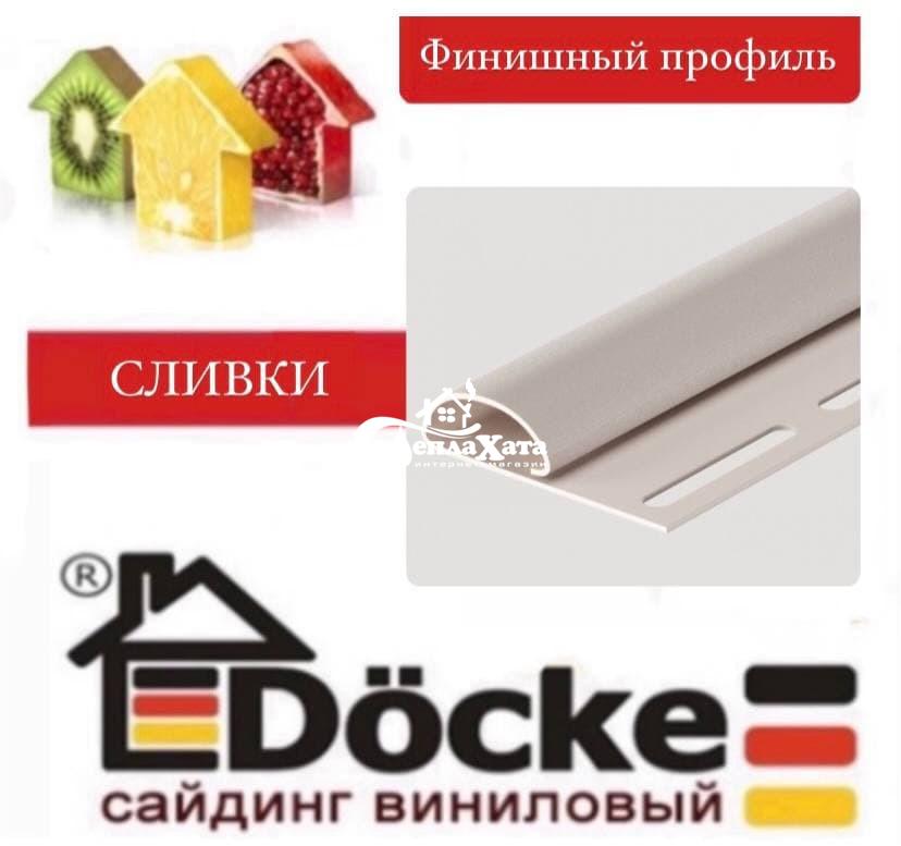 Планка финишного профиля Docke (завершающий профиль) применяется для завершения обшивки сайдинговыми панелями в верхней части фасада (для обрезки горизонтально), для крепления панелей сайдинга под окном и для крепления околооконного профиля по периметру окна. Также, финишный профиль используется для крепления J-фаски на карнизных свесах.