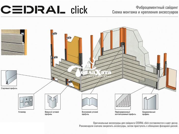 Конфигурация фиброцементного сайдинга Cedral Click имеющая пазы для потайного крепления, крепится специальными клямрами из нержавеющей стали, при помощи самореза из нержавейки.